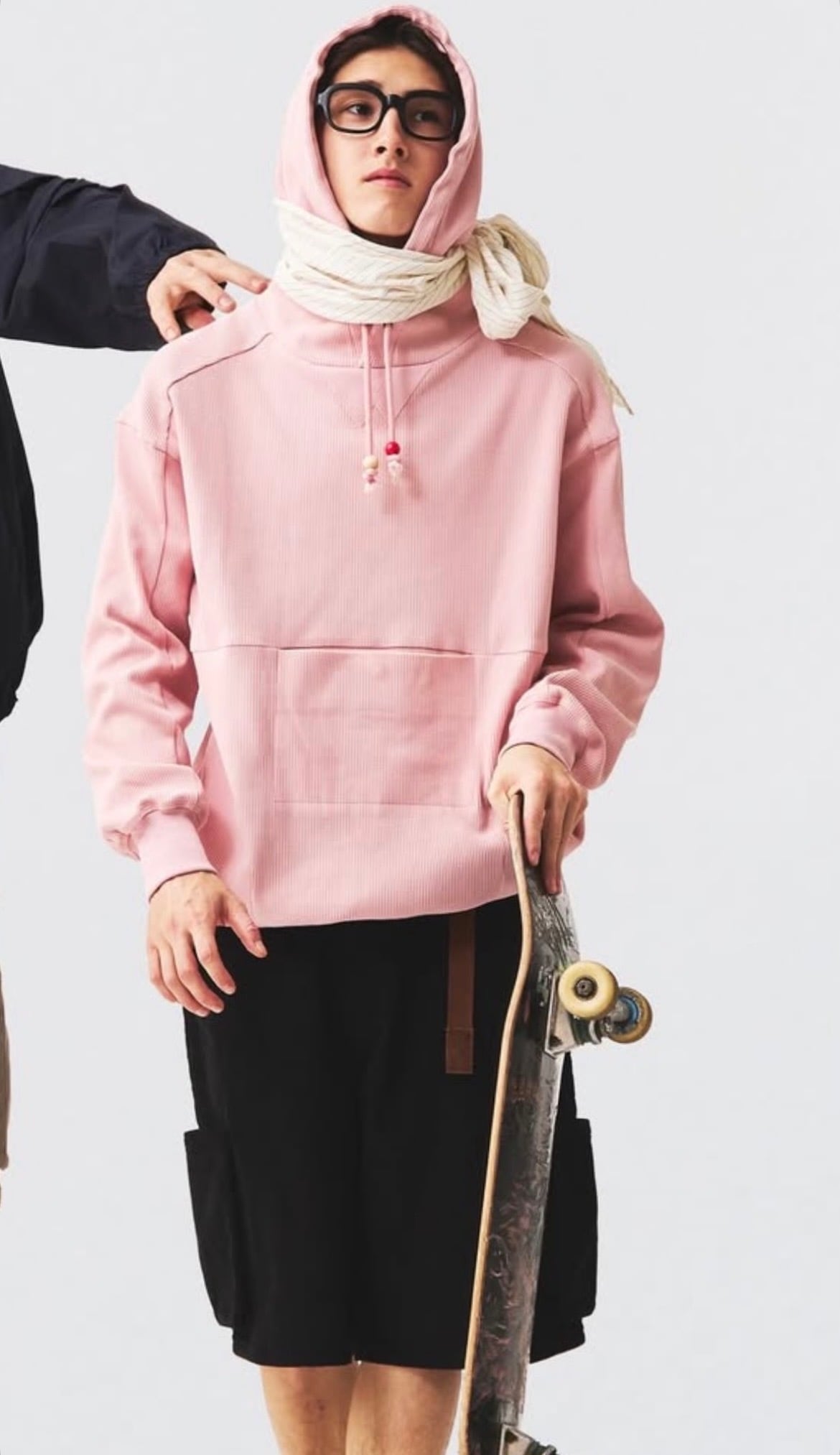 サイズ:M / L / XL カラー:SAKURA / WHITE HEATHER 素材:COTTON95% POLYURETHANE5% ゆったりとしたサイズ感に存在感のあるフードが立体的なシルエットを演出する。サイドポケットに加え、フロントにはカンガルーポケットを配置し、ドローコードにはビーズをあしらいアクセントに。ガゼットがWとなっているのもWHIMSYならでは。リブが短い分溜まり方がゆったりとしたシルエットとなり、一枚で着ても、レイヤードでも成立する絶妙な厚みも特徴的です。