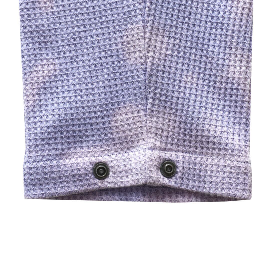 ベースレイヤーとしてインナーウェアのイメージがあるサーマルを1枚でゆるく着るようサイズ設計。その1点1点を手染めでタイダイ染め。袖のスナップボタンは袖幅の調整に一役買い、ラウンドカットされた身ごろが他の洋服と着合わせた際に存在感を放つ。全体的にルーズなシルエットながら腕まわりはすっきりとしており、野暮ったくならずインナー、トップスと着回しのしやすい1着。