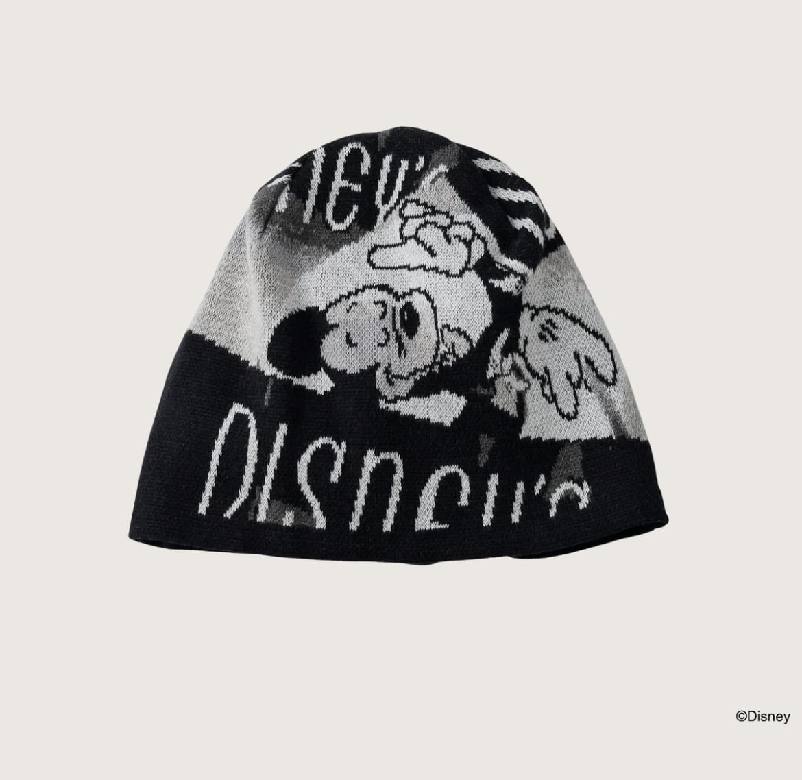 モノトーンで表現されたミッキーが印象的なニットキャップ。