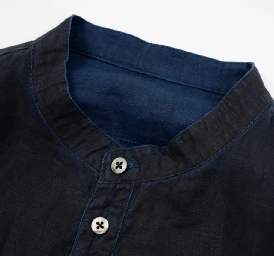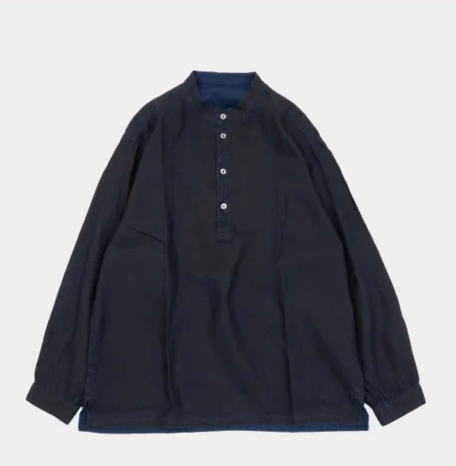 ラフに着ることのできる緩めのフィットのシャツです。表裏で異なる色という生地の特性を生かし、リバーシブルで着用できる仕様としています。裏面のインディゴの色を表にした際にも、表側の墨の色が極力見えないよう、各パーツの配置や縫製を工夫しています。ボタンには、リバーシブル仕様を可能にする太鼓釦を採用しています。職人の手作業を必要とする太鼓釦は近年需要が減り、製作できる職人も限られていますが、こうした仕様を取り入れることで、その技術を継続していく一助になればと考えています。