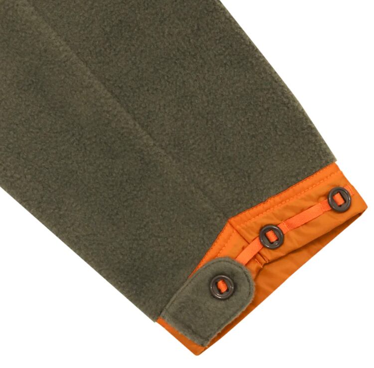 襟元のスナップボタンや袖元のパラシュートボタン、ラウンドカットされた後ろ身ごろが特徴。着丈は短めかめで、広めに設定された身幅、腕幅はインナーにスウェットなどをストレス無くレイヤード出来る。