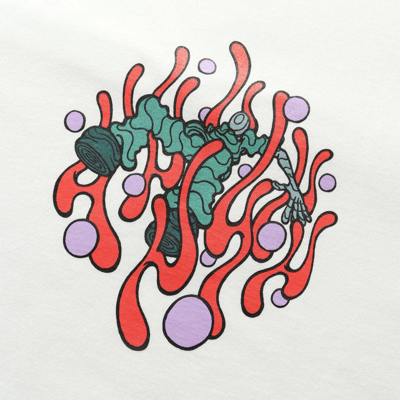 クラブシーンからインスピレーションを受け創作をするMAHSによるデザイン。音やクラブのフロアを彷彿とさせるグラフィックをシルクスクリーンでプリントした1着。
