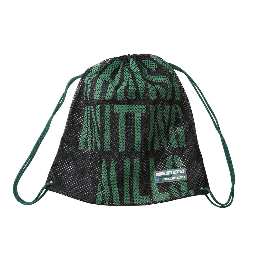 フロントに’’WHIMSY KNITTING MILLS’’のテキストをプリントしラバータグをプリントの上から縫い付け。ヒモとプリントがアクセントになっている。