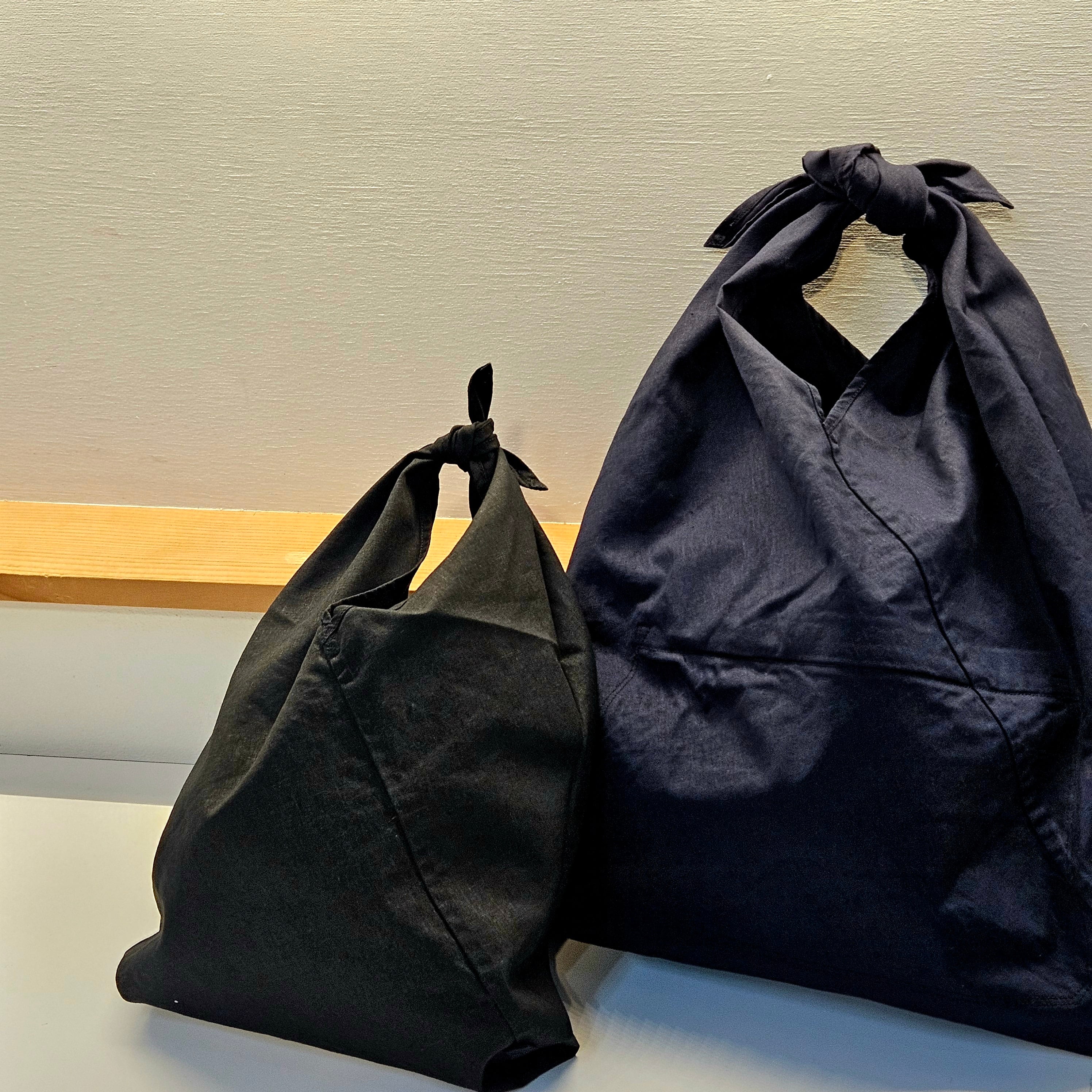 「結ぶ」と「包む」という、日本人が古くから自然と受け継いできた所作と精神性に着想を得たバッグです。あずま袋が2つ繋がった特徴的なデザインで、一つを裏返すことでバッグが二重に重なり、内側と外側でセパレートして使うことができます。結び方を工夫することで斜めがけや手持ち、肩がけなど使い方の幅が広がり、長さの調節も可能なため、多くの人にちょうど良いバランスで持つことができます。